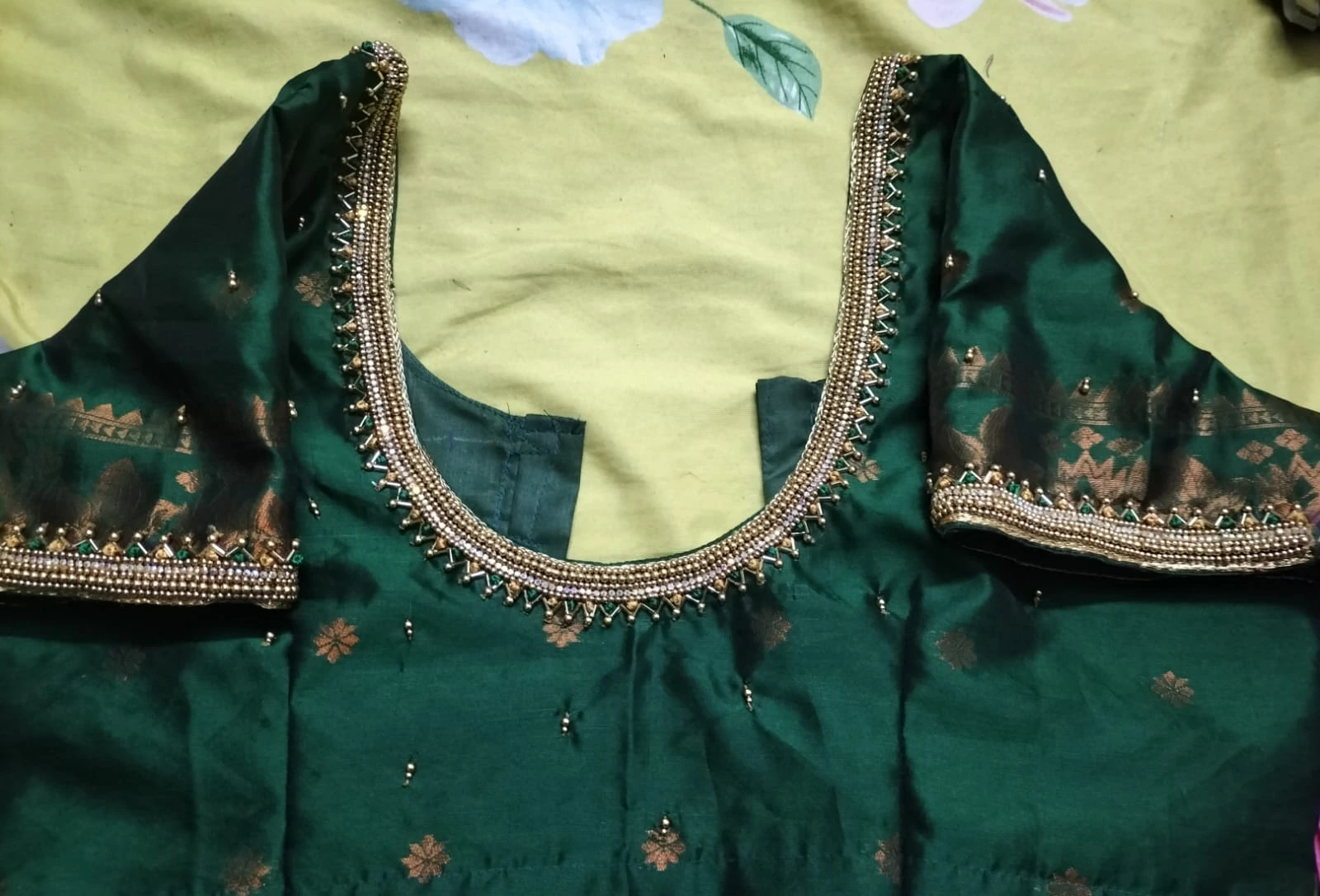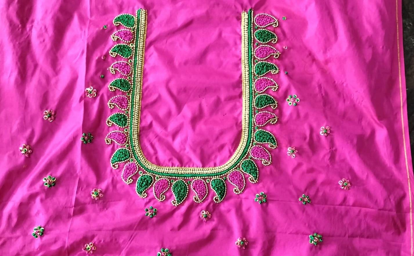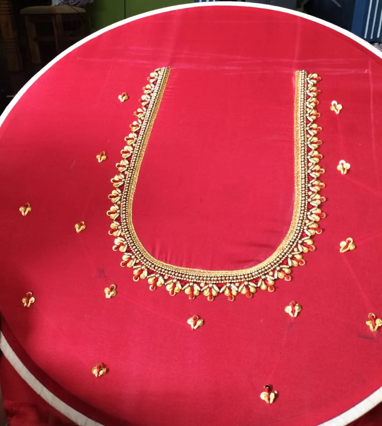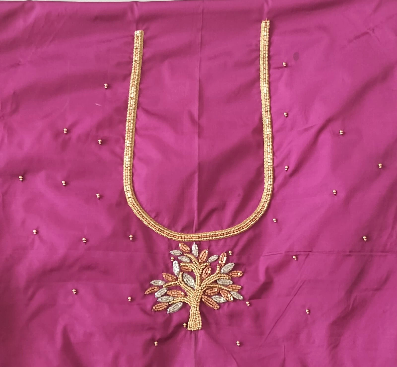 Whether you’re looking for a bridal blouse with rich Aari or Maggam work, a simple and elegant thread embroidery for a festive outfit, or a fully customized design with your initials or special motifs, we bring your ideas to life with precision and creativity.